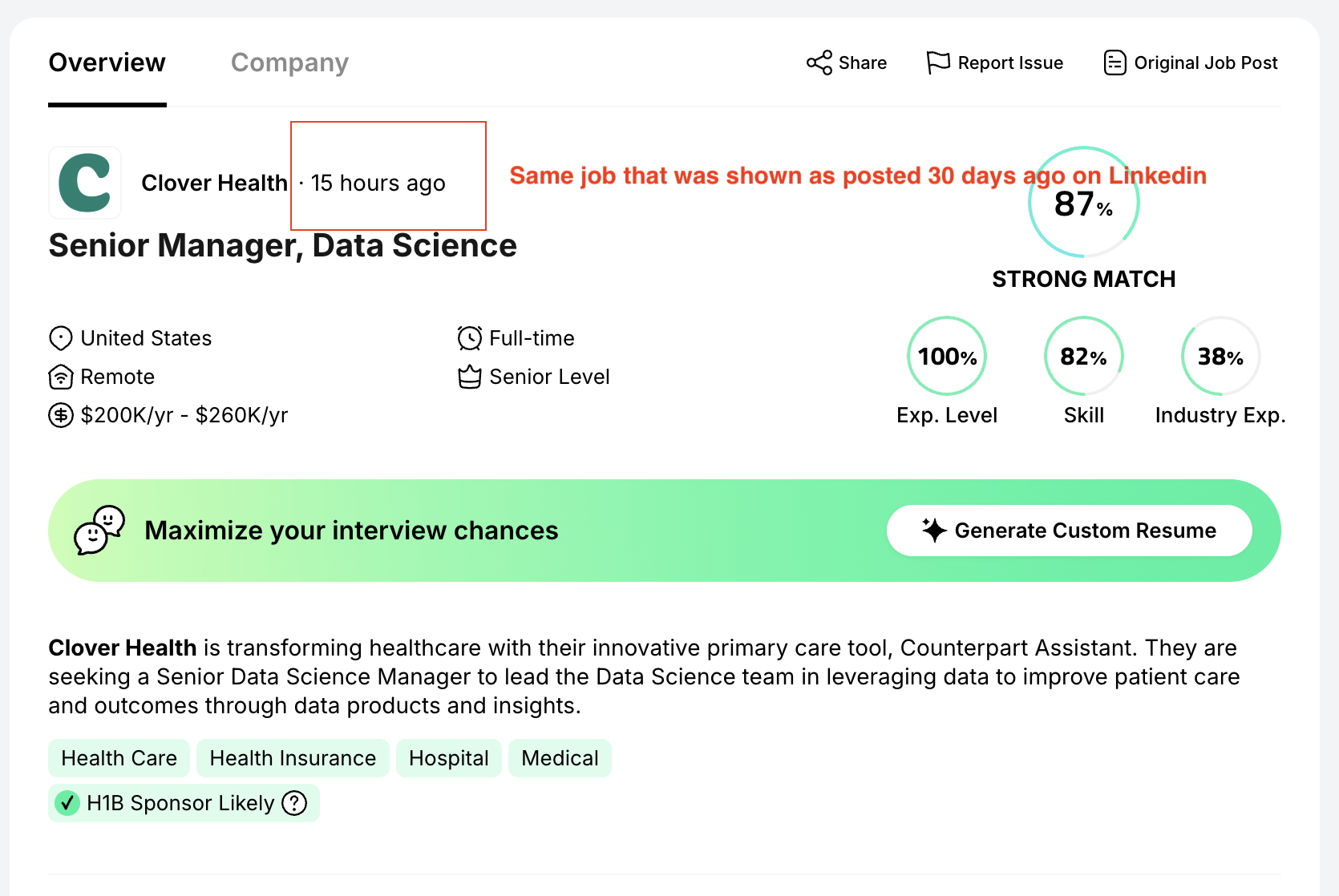 Something to be aware of: We observed cases where jobs appeared as “15 hours ago” in Jobright, but the same posting on LinkedIn showed “3 months ago” with 100+ applicants. This could result in users applying to older jobs, thinking they’re posted recently, leading to rejections or no responses from recruiters.