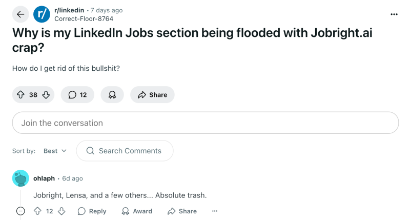 Some users on Reddit have reported that Jobright listings appear to “flood” their LinkedIn Jobs feed. These are typically reposts of employer jobs that redirect to Jobright’s platform rather than the employer’s original application page. This practice has raised questions about whether it aligns with LinkedIn’s job posting policies
